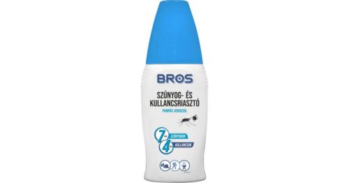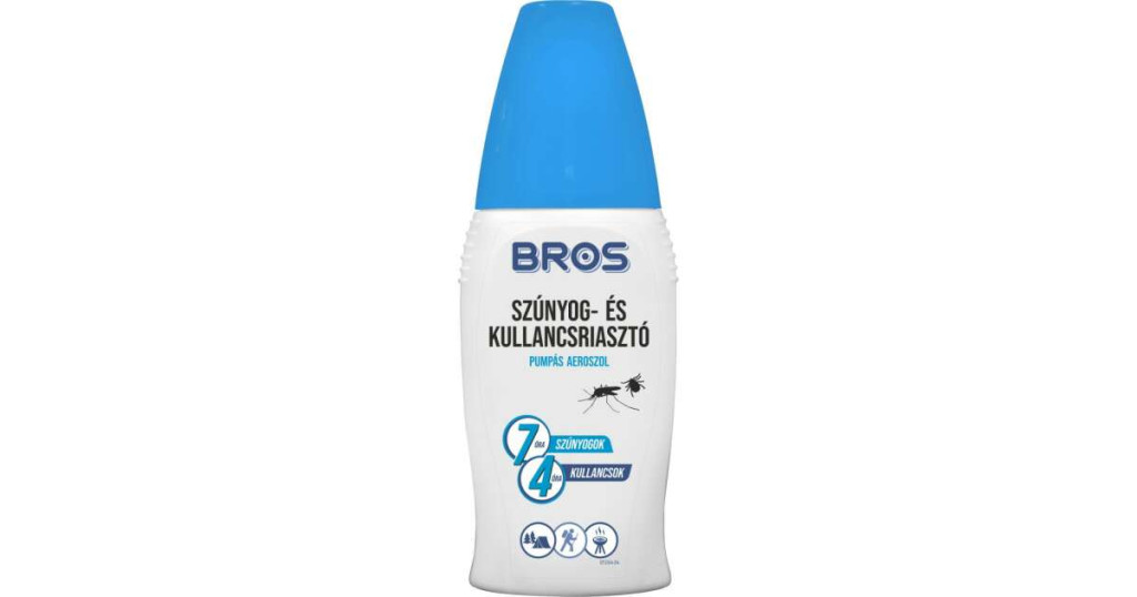 Bros 100 ml. űrtartalmú szúnyog és kullancsriasztó hajtógáz nélküli pumpás kiszerelésben. Szúnyogok ellen legfeljebb 7 órán keresztül, kullancsok ellen legfeljebb 4 órán keresztül nyújt védelmet.