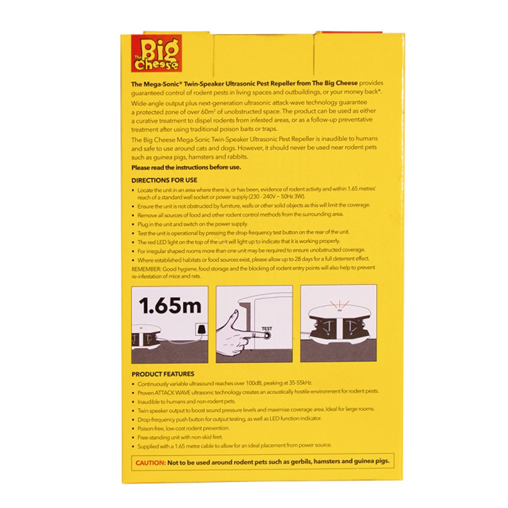 Hatékony lefedettségi zóna: a készüléktől számított 280 fok, és 8 méter távolság, mely összesen több mint 60 m2 védett övezet a szabad térben. A The Big Cheese Ultra Power ultrahangos rágcsálóriasztó készülék használat közben az emberi fül számára nem hallható az az ultrahangos frekvencia, mellyel a készülék dolgozik.